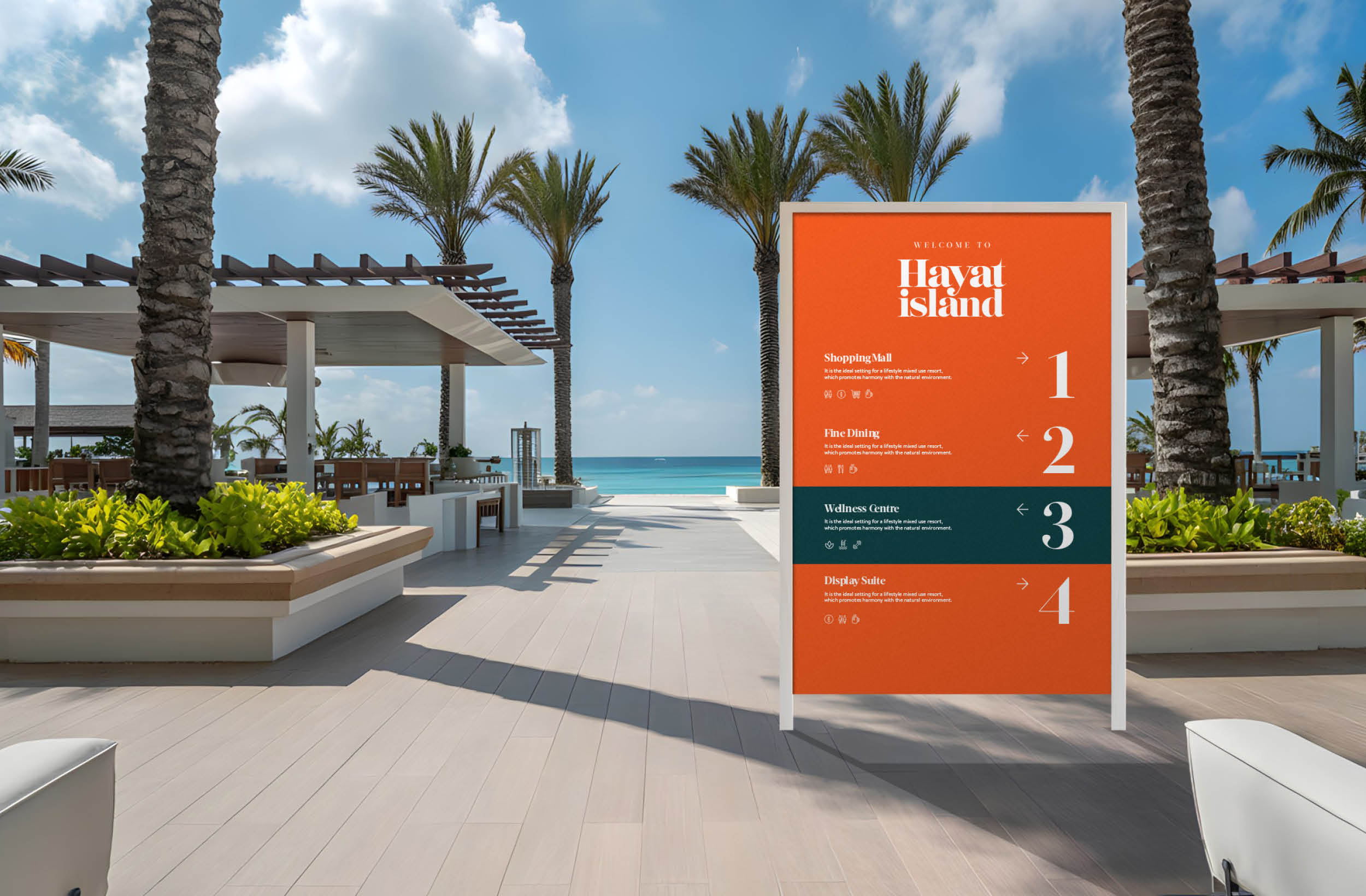 Beyond aesthetics, the brand operates as a unifying system across residential, hospitality, retail and public spaces. It brings coherence to a diverse masterplan while allowing each precinct to retain its own personality. The result is an island destination that feels cohesive without uniformity, vibrant without excess. Hayat Island becomes not just a development, but a living, breathing expression of modern island life in Ras Al Khaimah.